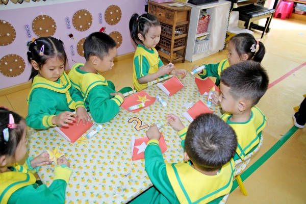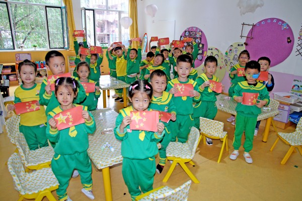 在教师的指导下幼儿动手制作了五星红旗,面对庄严的五星红旗,幼儿高声齐唱国歌。