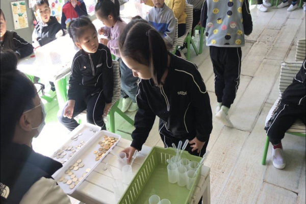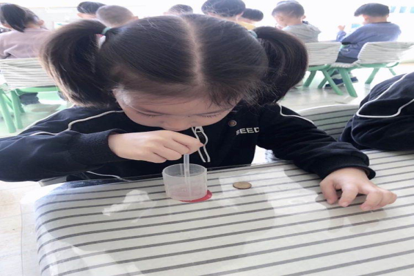 近日,向阳幼儿园中班段开展了科学小实验“水表面的张力”探究活动。