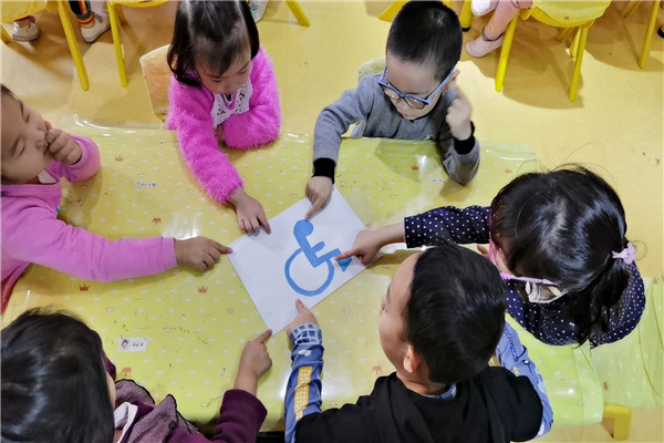 首先,教师引导孩子们通过社会体验活动《关爱残疾人》,全面了解了残疾人的生活状况及盲人行道、无障碍电梯等,孩子们认识了生活中与残疾人相关的标志,感受到了社会对残疾人的关爱。接着,孩子们围绕“生活中怎样帮助残疾人?遇到残疾人应该怎么办?”等问题进行了讨论。最后,师幼共同学习手语舞蹈《让爱传下去》,进一步激发了幼儿主动帮助残疾人的情感和愿望。