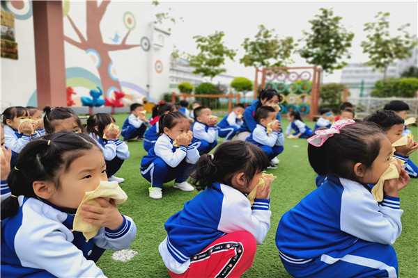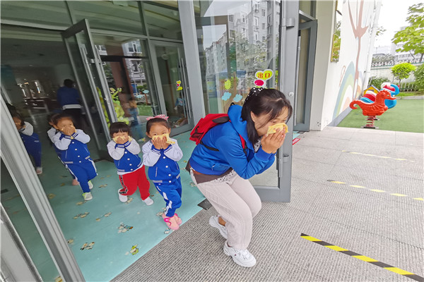 幼儿在教师的带领下,弯腰、用湿毛巾捂住口鼻,沿消防逃生路线并保持安全距离迅速逃生,撤离到幼儿园安全地带,中班班主任迅速清点人数并上报。