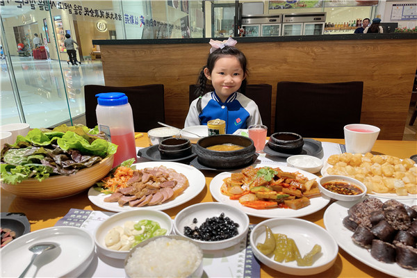 烤肉、紫菜饭团、姜汤、拌饭、米肠、辣白菜一道道传统的延边朝鲜族小吃,让小朋友们喜不自胜,直观的感受到了家乡的美好。
