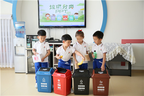 孩子们也在教师的引导下为节能减排积极行动着:中班幼儿从身边小事做起,节约每一滴水,每一粒米;大班幼儿通过学习垃圾分类,知道人们在生活中要减少塑料袋、荧光灯、电池等有害垃圾的使用。