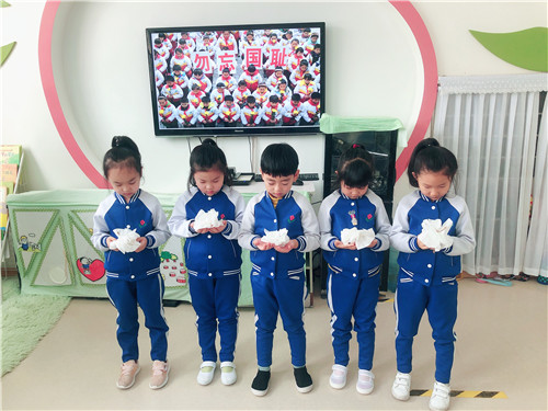 此外大班的孩子们做了一朵朵小白花以示哀悼;中班孩子们制作五角星祈福祖国美好的未来;小班孩子用妙笔涂鸦的放肆表达了他们的爱国之情。