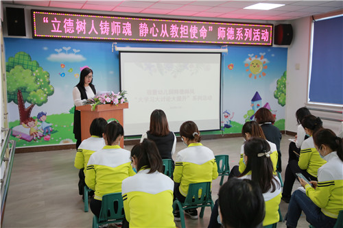 首先,蓓蕾幼儿园副园长张军向全体教师宣读了蓓蕾幼儿园师德师风“大学习大讨论大提升”活动实施方案,对其内容进行了详细地阐述,要求全体教师要高度重视自身的师德修养,提高思想觉悟,将师德师风培训内容内化于心、外化于形,强化红线意识和责任担当,坚守底线思维,争做“四有”好老师。