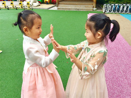 活动中,各班老师结合幼儿的年龄特点,通过观看视频、图片,了解民族特色美食民俗风情;聆听民族故事;欣赏民族歌曲;体验民族服装;感受民族舞蹈等活动方式,引导幼儿直观了解中国是一个多民族国家,知道每个民族都有自己独特的服饰、风俗习惯以及特色美食等。通过营造浓厚的民族团结氛围,让民族团结的种子种在幼儿的心中,构建中华民族一家亲的深厚情谊。