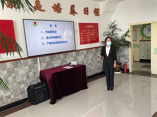 保健医生李今花主要讲解了诺如病毒感染性腹泻及呕吐物的处理、水痘、流行性腮腺炎、手足口病、急性出血性结膜炎、流感、猩红热等秋季易发生的传染病的知识要点。通过李主任细致讲说,老师们对传染病的传播途径、主要症状、易感人群、预防措施有了深入的学习,促进了老师们对传染病知识的认识,帮助老师更好的掌握了正确的预防措施。在传染病的多发季节,李主任结合现状也为大家讲解了传染病的日常防控要点,并要求班级加*生保健消毒工作;认真做好晨午检、缺勤追踪的工作,做到早发现、早报告、早隔离、早治疗。