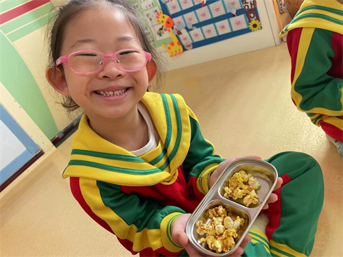 天然无添加的爆米花新鲜出炉了,香味扑鼻而来,整个教室里弥漫着淡淡的香味。孩子们已经迫不及待了,让我们品尝美味的爆米花吧!