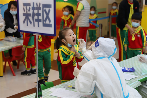 2022年3月3日,延吉市新苗幼儿园全体师幼依据疫情防控部门安排进行首轮核酸检测。核酸检测现场新苗宝贝个个整装待发,都很积极配合医生的检测,非常勇敢。