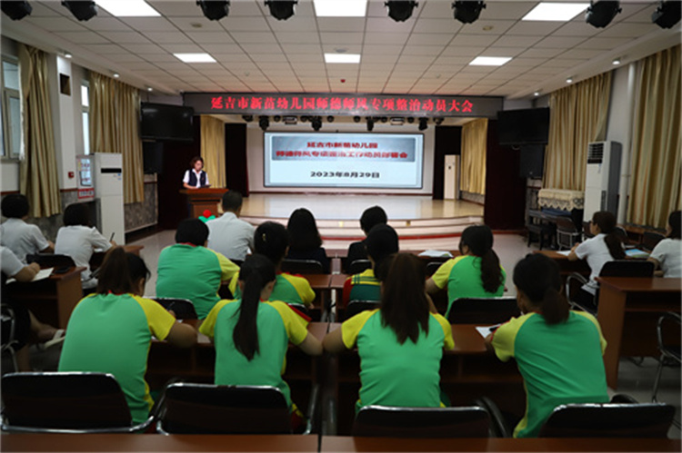 为进一步强化幼儿园师德师风建设,规范教师职业行为,明确师德底线,规范教师从教行为,2023年8月29日中午,延吉市新苗幼儿园组织全体教职工开展了师德师风专项整治工作动员大会。