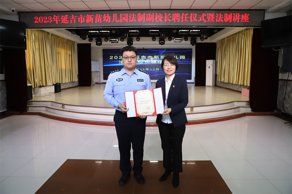 活动中,新苗幼儿园园长崔文淑为北山派出所候宇泽副所长颁发了法治副园长聘书,共同维护校园安全秩序。
