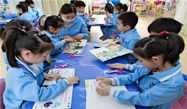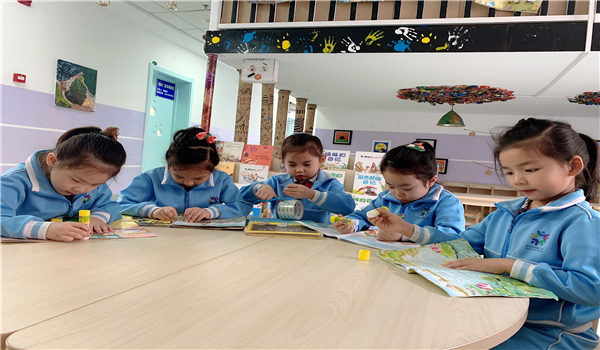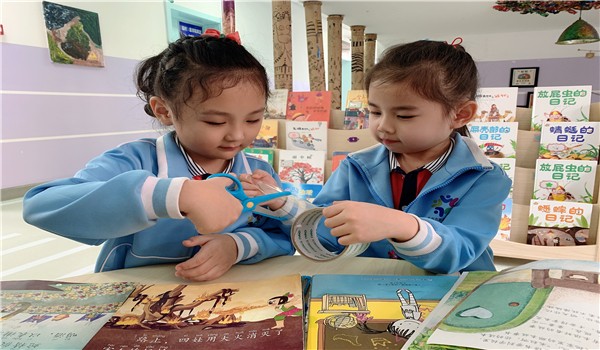 大班的孩子们来到绘本馆,对破损的图书进行仔细的修补,大家用自己勤劳的双手为幼儿园的环境增光添彩。