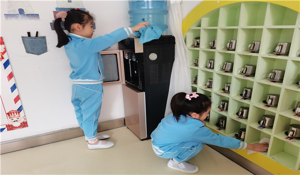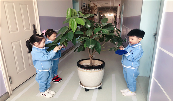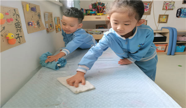 孩子们拿起了抹布,细致认真地对幼儿园内的植物、走廊扶手、桌椅书柜进行擦拭清洁;