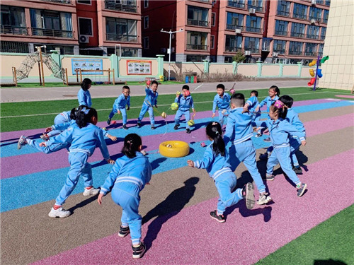 游戏开始前,教师通过观看图片、视频演示等方式向孩子们介绍了沙包的制作方法以及各种玩法,孩子们热情高涨,迫不及待的参与其中。在游戏中,教师适时参与,做幼儿的玩伴,引导幼儿一物多玩,探索出沙包的趣味玩法,孩子们你扔我接,灵活躲闪,幼儿园变成了沸腾的游乐场。在“合力运沙包”游戏中,同伴们背对背手拉手,模仿螃蟹横着走,齐心协力的运送沙包。而“乌龟运粮”游戏,孩子们则像“小乌龟”一样趴在地上,小心翼翼的驮着沙包爬行走,保证沙包不能掉落地上。在沙包炸碉堡、平衡沙包等游戏中,孩子们也玩得乐此不疲,兴致盎然。他们主动探索,大胆创新,趣味的沙包游戏让孩子们银铃般的笑声传遍幼儿园的每一处角落……