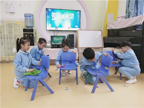 活动前,幼儿与爸爸妈妈共同讨论了他们的不同职业,并将家人穿职业装和工作时的照片带到幼儿园与同伴快乐分享,增强对劳动者的敬佩之情。教师利用视频、图片等形式为幼儿介绍了“五·一国际劳动节”的来历和意义,进一步激发对劳动者的尊重与敬意,也体会到了家人们工作的不易。随后,孩子们积极踊跃的加入到劳动实践中,带上手套为种植区铲除杂草、为新修剪的花草树木浇水,大家忙的不亦乐乎,幼儿园里荡漾着欢声笑语,处处充满了劳动带来的快乐!在班级里,幼儿们纷纷变身“劳动小达人”,拿起抹布擦桌子擦椅子、整理小背包、叠被子……孩子们忙碌的小小身影让班级焕然一新,辛勤的汗水润泽了幼小的心灵。