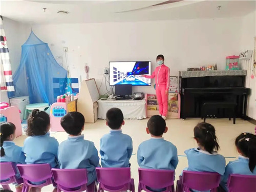 活动中,教师通过视频、图片带领幼儿领略了我国科技成果风采,长征五号B遥二运载火箭是怎么发射升空的?北斗卫星是怎样为我们导航的?未来智能化的幼儿园是什么样子的?孩子们聚精会神聆听着,对科学家进行实验过程充满了好奇,感受着中国科技的伟大成果。