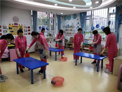 消毒竞赛中,保育教师提前准备好消毒物品,按照一清二消毒三清洁的操作流程对桌面进行擦拭清洁,并对消毒液的配比准确性、正确喷洒消毒液的方法,擦拭桌面的方向、消毒流程、消毒时间等进行了解说,她们个个精神抖擞,动作干练、专注高效地完成了比赛。