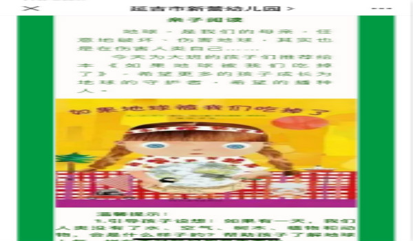 活动中,新蕾幼儿园通过公共资源平台、微信平台推送了“爱护地球,守护希望”居家活动建议,指导家长、幼儿通过居家运动、亲子阅读、居家种植、科学游戏等多种形式来践行绿色生活理念,提高环保意识。