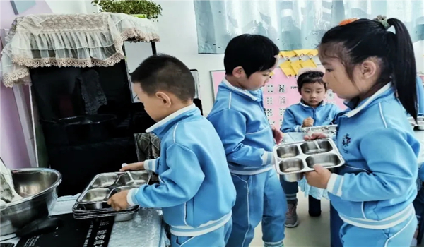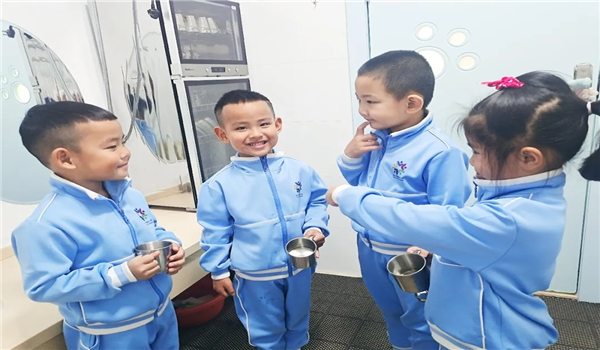 每日餐前,孩子们会在老师的指导下,按照七步洗手法正确洗手,做好餐前准备。“美食小助理”组织大家共同朗诵儿歌《我是一粒米》、古诗《悯农》,增强爱惜粮食的情感,感受农民伯伯的辛劳。随后,“美食小助理”会详细的介绍午餐的菜品、营养,以及文明进餐的礼仪。愉快进餐开始啦,孩子们一口饭,一口菜,班级里的进餐秩序井然有序。餐后的幼儿轻轻地将自己的椅子摆放整齐,摆放好餐盘,有序排队漱口,看着镜子中的自己,开心的和同伴说:“我嘴里的小菜叶都不见了”“我的牙真白呀”。