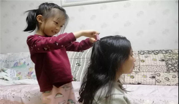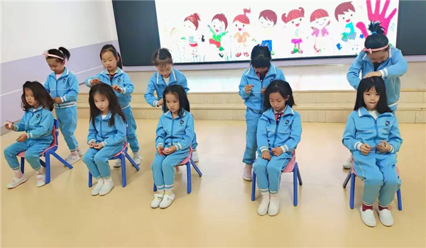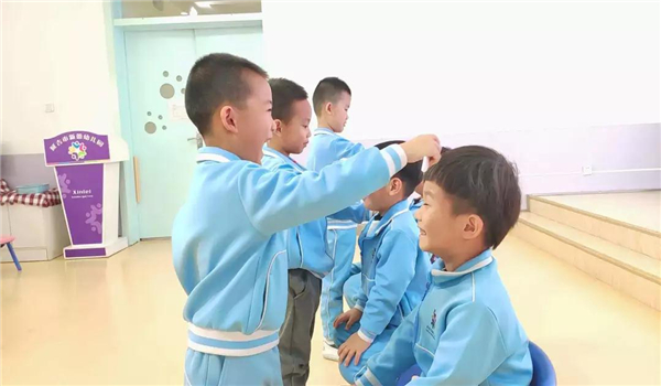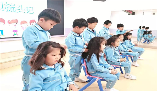 第一次把梳头的机会交给幼儿,孩子们兴奋不已,积极踊跃的参与其中。自己扎头发有点难,孩子们就请同伴来互相帮忙,男孩子也不不甘示弱,积极的参与其中,认真的样子一点也不比女孩子差。老师也成了孩子们的“模特”,在有趣的互动练习中,孩子们已能熟练地将自己的头发梳直,并在同伴的帮忙下扎好辫子。