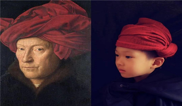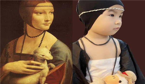 活动前,教师和幼儿共同收集资料,欣赏大师的绘画作品,幼儿对名画产生了浓厚的兴趣,在教师的倡议下,一场趣味十足的名画模仿开始了。孩子们脑洞大开,在爸爸妈妈的帮助下找来了床单、浴巾、勺子、杯子、蒲扇、围巾等各种道具,对比图片进行模仿,用亲子的无限创意向经典致敬!生动夸张的神态,极具创意的造型,大家通过细致观察和精心揣摩,将名画中的人物形态、动作、眼神,模仿展示的栩栩如生、惟妙惟肖。