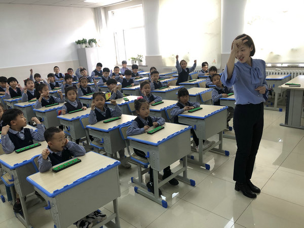 走进一年十三班,小朋友的课桌上都摆放着小算盘,该班科任教师娄慕麒正在与孩子们进行珠心算的学习,一双双小手在教师的引导下,拨动着课桌上的小算盘,教师每一次从身后抽出的卡片都能让孩子们迅速用算盘算出答案,在“算速”之间,孩子们的欢声笑语不绝于耳。