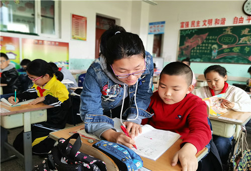 朝阳川镇光华小学英语教师正在为学生进行作业指导