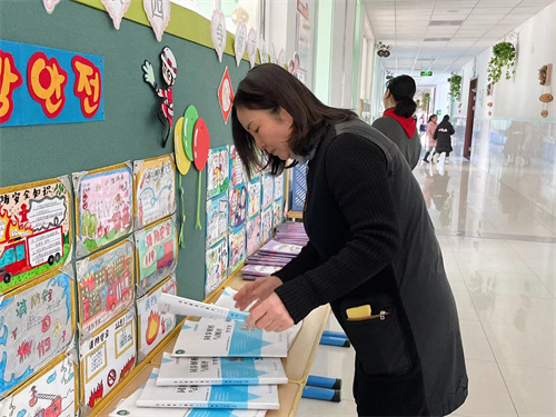 本次活动由一至六年级各班展出语文、数学、朝鲜语文、英语这4个学科的作业。展评活动伊始,学生们在班主任的带领下有序参观,驻足在展台前的学生们仔细翻看着作业本,那认真端详的双眸,成为了校园最美丽的冬景。公园小学校校长刘红月、副校长许红燕、郭鲜花、教科研主任林海月、语文教导主任金雪梅、信息技术主任申晓燕全程参加此次活动。校长刘红月指出此次活动中展示的作业本批改符号规范,学生有订正,教师有复批,符合学校批改要求。