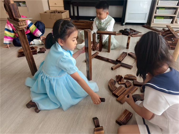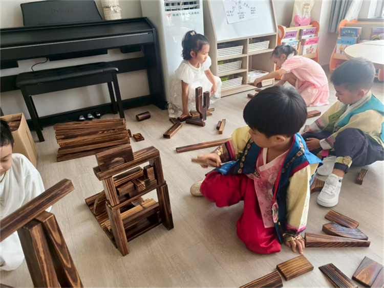 区域活动中,孩子们将手中的积木、纸盒变成了“坚固的堡垒”“霸气的战车”,在分工合作和搭建中感受家乡的发展变化;歌舞环节更是将气氛推向高潮,孩子们身着色彩鲜艳的朝鲜族服饰,跟着节奏跳起活泼的农乐舞,唱起朗朗上口的延边童谣,清脆的歌声与灵动的舞姿,传递对延边朝鲜族自治州、对祖国妈妈的深深祝福。