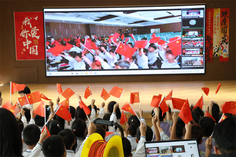 随后,大二班幼儿领唱《歌唱祖国》,熟悉的旋律通过云端在三地回荡,华夏童声共同唱响对伟大祖国的热爱与祝福,现场气氛庄重而热烈,活动在孩子们依依不舍的双语告别声中圆满落幕。