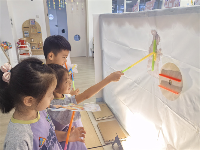 灯火阑珊处,清梦星河边,灯笼是承载中秋美妙夜景的吉祥物。孩子们化身“小小艺术家”,通过涂一涂、画一画、剪一剪、贴一贴的形式为中秋献爱意,亲身感受传统节日的意蕴与魅力,一个个造型可爱的玉兔灯笼、色彩艳丽的中秋贺卡、栩栩如生的月饼捏捏乐……孩子们用巧手绘中秋,用色彩和线条勾勒出属于他们的中秋印象,捧着自己的作品相互展示,脸上洋溢着满满的成就感,体验着“竖中秋”的欢乐的同时,寄托了对亲人的思念和美好的祝愿。“小时穿黑衣,大时穿白袍,水里过日子,岸上来睡觉”“独木造高楼,没瓦没砖头,人在水下走,水在人上流”……猜灯谜区充满了欢声笑语,五彩的灯笼下悬挂着一张张灯谜卡片,孩子们围着灯谜冥思苦想,猜到答案的瞬间欢呼雀跃,现场热闹非凡。在你一言我一语中,热闹的探秘中秋,一起感受中华传统文化的源远流长和无限魅力!在“中秋小侦探”为主题的寻宝游戏中,孩子们积极踊跃的参加到探寻宝物中,在实践活动中收获节日的喜悦和祝福。为庆祝中秋节的到来,孩子们各显神通,学唱《欢庆中秋》的手势舞、儿歌,用美妙的歌声和优美的动作,表达自己的美好祝愿;表演精彩的皮影戏故事“嫦娥奔月”,深深地吸引着小观众们,大家津津有味的欣赏着,收获着,致敬经典,弘扬优秀传统文化,孩子们用自己的热情和才华,编织着对团圆、和谐与美好未来的无限憧憬。