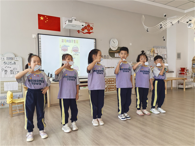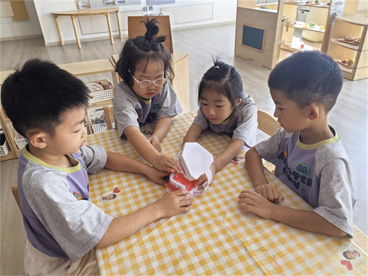 活动中,教师通过生动形象的PPT、动画短片,向孩子们讲解了牙齿的作用、龋齿的形成原因。“小牙齿就像小卫士,帮我们嚼碎食物,要是有了龋齿,牙齿就会疼得“哭”哦……教师用童趣的语言,让孩子们轻松了解到保护牙齿的重要性。