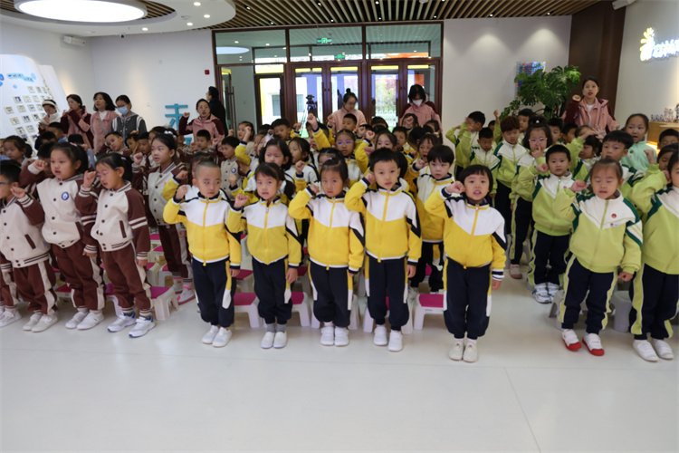 师幼共同宣誓环节将整个活动推向高潮。全体教师和大班幼儿整齐列队,右手握拳举过头顶,在主持人的带领下庄严宣誓,稚嫩却坚定的童声与教师们沉稳有力的声音交织在一起,回荡在幼儿园的每个角落,展现出师幼共同推动智慧化阅读落地的决心与热情。