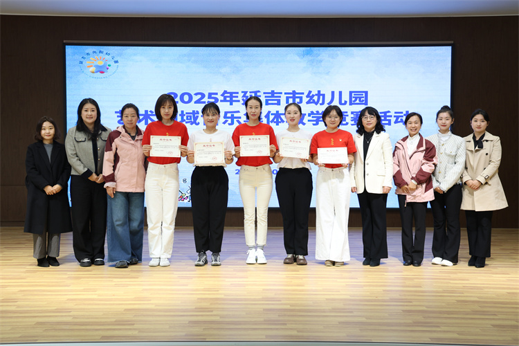 竞赛活动中,教师们紧扣幼儿年龄特点与兴趣需求,将音乐元素与游戏、表演等形式巧妙融合。唐迪老师组织的大班音乐游戏活动《功夫武侠》以功夫为主题,引导孩子们跟随节奏创编武术动作,在铿锵有力的旋律中感受中华武术的精气神;黄锦老师组织的中班歌唱活动《国旗红红的哩》,通过生动的歌唱与情境创设,让孩子们在欢快的歌声中萌发爱国情感;李慧跃老师组织的大班音乐游戏《玩具舞会》,鼓励孩子发挥想象,为玩具设计独特的舞蹈动作,在互动中体验合作与创造的乐趣;李静老师组织的大班歌唱活动《小鸡的一家》,以活泼的歌曲为载体,结合角色扮演,帮助孩子理解家庭成员间的亲密关系;刘舒宁老师组织的大班音乐欣赏活动《森林之王》则通过音乐欣赏,引导孩子感受不同节奏、音色所表现的森林情境,培养音乐感知力。出课教师们用精心设计的教学环节、充满感染力的现场表现,为我们呈现了一场精彩的音乐教学盛宴,这份专业与用心值得肯定与赞扬。随后,延吉市教师进修学校学前教育教研部薛瑞红老师,为出课教师逐一颁发荣誉证书,李慧跃、黄锦、李静老师在2025年延吉市幼儿园艺术领域音乐集体教学竞赛暨研讨活动中,荣获一等奖;唐迪、刘舒宁荣获二等奖,鲜红的证书不仅是对教师专业能力的认可,更是对他们深耕幼儿艺术教育的鼓励。