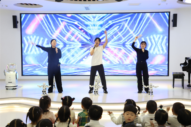 中班段以“星光音符・童趣乐章”为主题,将趣味互动与多元表演深度融合。主持人与音乐节专属卡通形象“音音” 的活力互动,瞬间点燃全场气氛,音乐节专属AI卡通形象吉祥物“符宝”用可爱的声音发出邀请,引得孩子们纷纷举手回应。机器人舞蹈惊艳亮相,灵活的机械动作与动感音乐完美契合,赢得孩子们阵阵欢呼;各班轮流欢唱,清澈的嗓音交织成童年的美好乐章,台下同伴们跟着节奏拍手附和,现场化作欢乐的音乐海洋。灯光暗下,教师们手持荧光道具带来的荧光舞震撼全场,光影交织间宛如夜空中的小星星,让大家沉浸在梦幻氛围中。“听音乐做动作”“节奏传递” 等全员参与的音乐游戏,让孩子们在欢笑中加深了对节奏的感知。