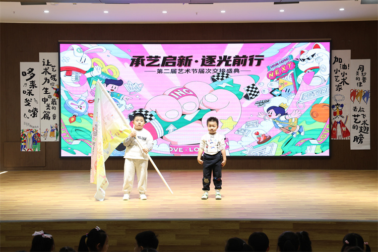 大班段以“艺起成长,童梦未来”为主题,凸显幼儿的参与感与责任感。孩子们以一场特别的“创意签到”率先点燃了艺术氛围:孩子们从签到墙上随机抽取由同伴亲手绘制的艺术贺卡,每一张独一无二的“艺术盲盒”都是童心的交换与温暖的传递。在科技与艺术交融的“AI交互启动仪式”上,全场孩子共同倒数,用神奇的“艺术密钥”开启了光影流转的创意之门。大班幼儿作为艺术节的先锋力量,展现了十足的担当,他们作为“艺术小使者”向全体伙伴发出倡议,号召大家“以笔绘梦,以声传情”,共同参与到艺术节的探索中。在庄重的旗帜交接环节,幼儿代表接过象征艺术梦想的旗帜,完成了责任的传承与创意的接力,宣告艺术的火种将在幼儿园持续闪耀。随后,老师们也带来了温情的表演,用艺术诠释了爱与陪伴的真谛。